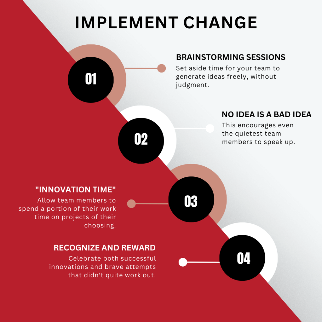 Celebrate creativity. Recognize and reward innovative ideas, even if they don’t all pan out. This shows your team that thinking outside the box is valued.