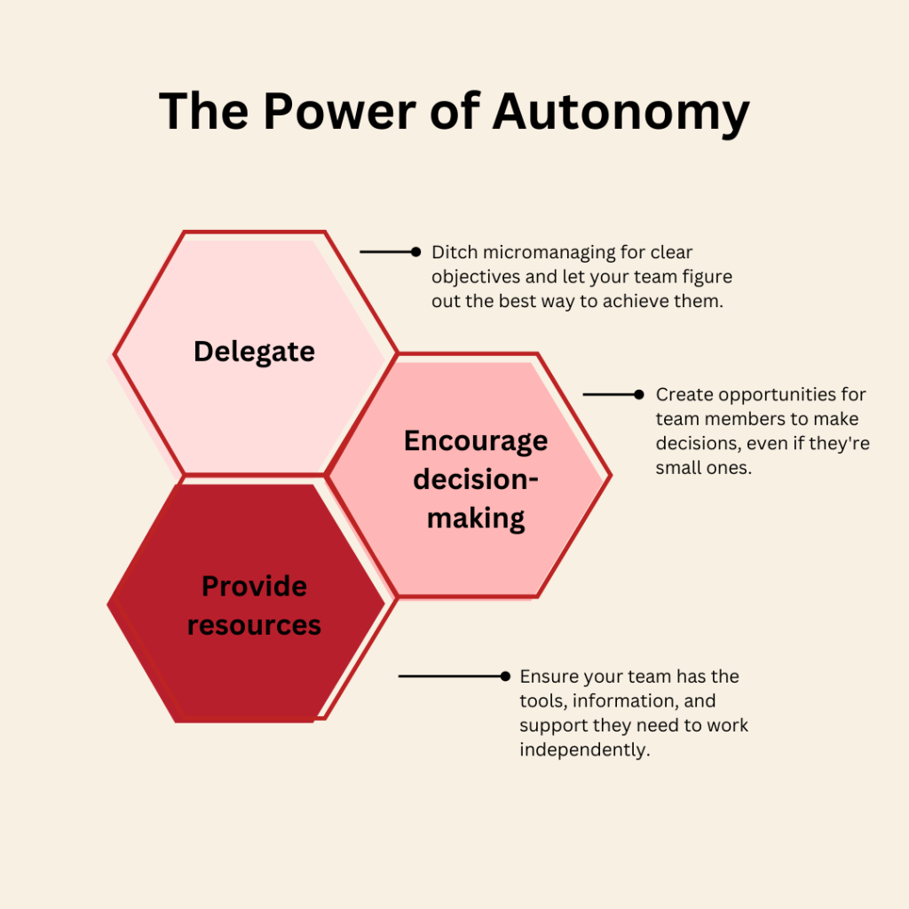 Autonomy is the fuel that ignites innovation. When team members have the freedom to make decisions and choose their methods, they’re more likely to come up with creative solutions. Here’s how you can foster autonomy: